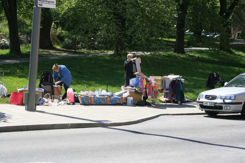 Varje år öppnas gatorna i Högalid, Stockholm för de närboende att fritt sälja av sina gamla prylar ute på gatan. Snabbt fylldes gatorna på morgonen och förmiddagen av Söderbor som tagit chansen att rensa ur vindar och garderober och samtidigt tjäna en slant. Detta sällskap packade upp sina prylar vid Högalidsparken.