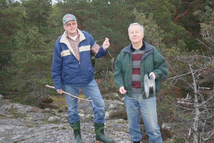Första steget är alltså att dra ut ett par lämpliga antenner. Det blev två trådar på hundratals meter i riktningarna cirka 285 och 315 grader, vilket innebär optimal förstärkning på inkommande radiosignaler från Karibien och Centralamerika respektive Nordamerikas östkust och en del av prärien. Här ser vi antennuppsättarna Rolf och Lasse från MRS. Observera den improviserade linjestången som används för att hissa upp antenntråden till högt belägna grenar.
