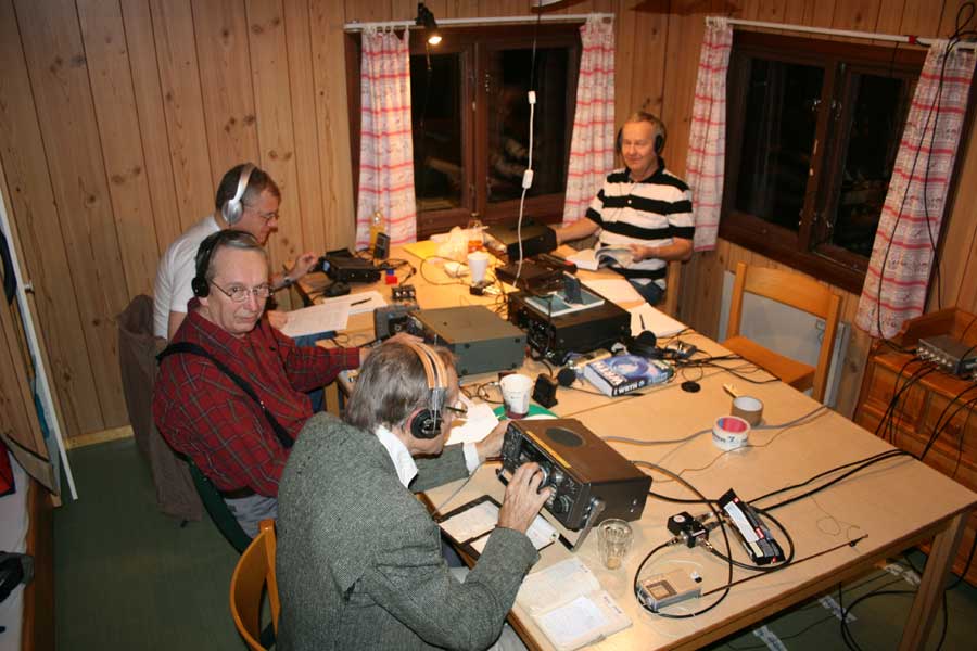 Väl inne i stugvärmen var det så dags att slå på radioapparaterna och vi kunde snabbt konstatera att antennerna fungerade bra. Längst till höger två antennfördelare som skickar signalen vidare till de olika lyssnarplatserna och alla kan med hjälp av antennomkopplare välja vilken riktning de vill lyssna på, oberoende av de andra. Detta läge är alltså mycket fritt från störningar och stationerna hördes klart och fint.