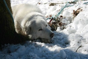 April 15, 2009 – 10:40 pmDet heter ju att hunden är människans bästa vän. Det finns många olika raser och vi har alla våra favoriter. Personligen är det en alldeles speciell ras och en alldeles särskild representant för denna ras som har ett stort utrymme i mitt hjärta. Ona, pyrenéerhund. Ja, egentligen är hon döpt till Verona men det är det aldrig någon som säger. Det sägs om pyrenéerhundarna att de tar liten plats rent fysiskt trots sin avsevärda storlek men tar stor plats i hjärtat. Jag är den förste att intyga att detta stämmer. I dag fyller min bästa vän åtta år och det har vi firat på olika sätt, bland annat genom en god gemensam middag. Här ser vi födelsedagsbarnet utanför torpet i Delsbo under en snabbvisit i mars.